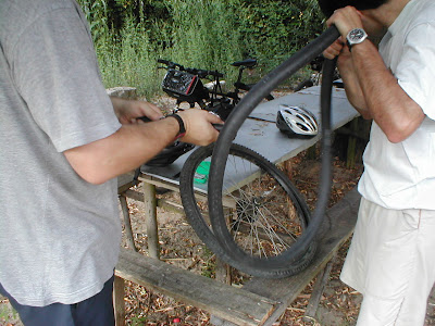 A tarde foi mais longa e mais puxada. Continuámos a Rota das Lagoas e apanhámos a dos Moinhos. O bom estado das ciclovias facilitou uma boa pedalada acompanhada, na maior parte das vezes, por agradáveis conversas. Mas, se não há festa de aniversário ou de casamento sem bolo, arraial sem foguetes também não há pedalada sem furo, por isso, eis que o furo marcou presença. Ora ao ser avisada de que a roda traseira da minha bicicleta estava furada nem quis acreditar, mas o pessoal não desmoralizou. Comprovado que era necessário repará-lo, parou-se e escolheu-se um local. O furo foi mais ao menos resolvido assim: «sacou-se» o pneu à bicicleta, retirou-se a câmara-de-ar, encheu-se a dita câmara, identificou-se o local do furo, raspou-se o local do furo, aplicou-se cola, que secou durante um bocado, aplicou-se um «remendo», introduziu-se a câmara-de-ar no devido lugar, encheu-se o pneu, colocou-se o pneu no respectiva bicicleta e a pedalada continuou. Viram agora porque é importante saber reparar furos e transportar o material necessário? Por lá, o pessoal só não viu como sentiu na pele.